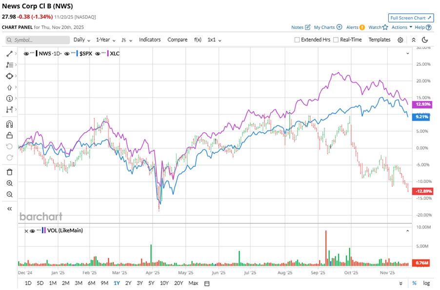 Shares of this global media and information services leader have underperformed the broader market over the past year. NWS has declined 11.7% over this time frame, while the broader S&P 500 Index ($SPX) has rallied nearly 10.5%. In 2025, NWS stock is down 8.1%, compared to SPX’s 11.2% rise on a YTD basis.