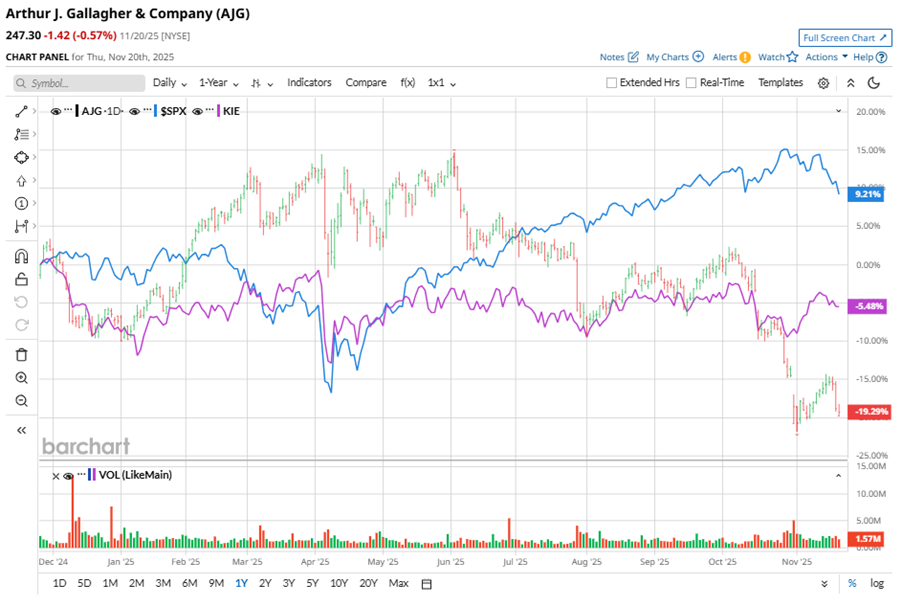 Shares of this insurance giant have considerably underperformed the broader market over the past year. AJG has declined 16.4% over this time frame, while the broader S&P 500 Index ($SPX) has rallied nearly 10.5%. In 2025, AJG stock is down 12.9%, compared to SPX’s 11.2% rise on a YTD basis.