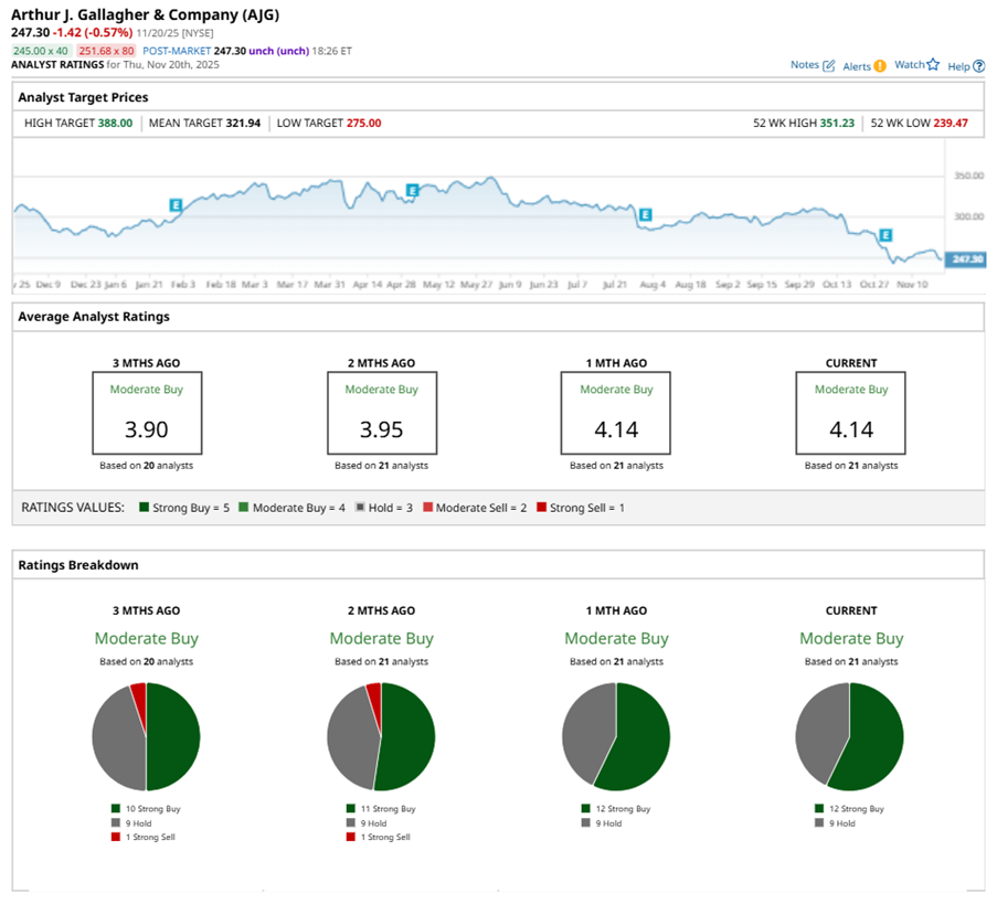 On Nov. 20, Barclays PLC (BCS) downgraded AJG to an “Underweight” rating with a price target of $250, implying a potential upside of 1.1% from current levels.