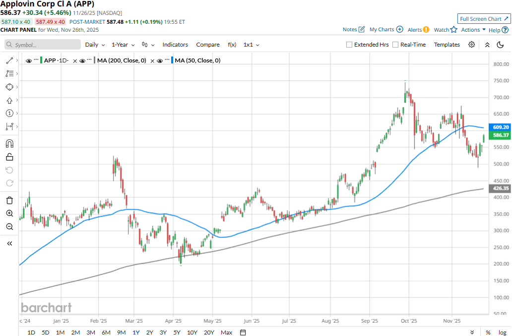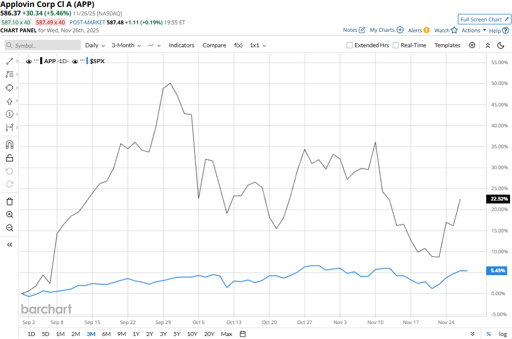 AppLovin touched its all-time high of $745.61 on Sept. 29 and is currently trading 21.4% below that peak. Meanwhile, APP stock has soared 24.9% over the past three months, compared to the S&P 500 Index’s ($SPX) 5.1% gains during the same time frame.