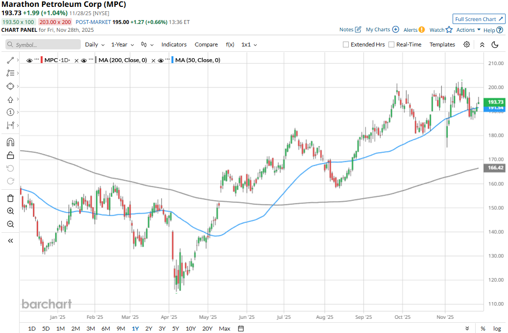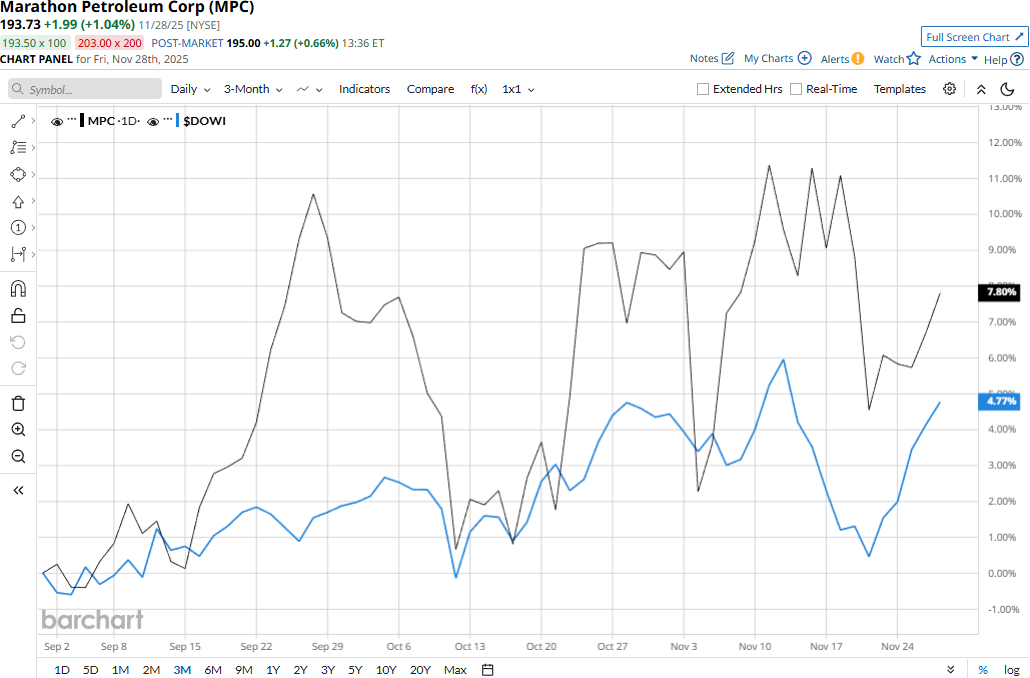 MPC stock touched its 52-week high of $202.29 on Nov. 14 and is currently trading 4.2% below that peak. Meanwhile, the stock has surged 8.1% over the past three months, outpacing the Dow Jones Industrial Average’s ($DOWI) 4.6% uptick during the same time frame.