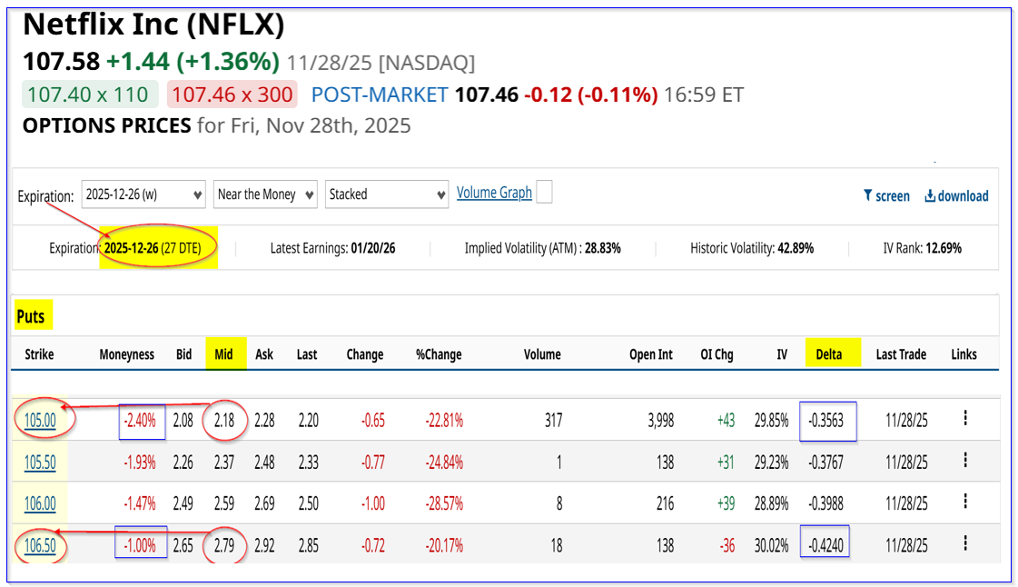 But now, it requires 10x less money to short one put. For example, a new short play expiring Dec. 26, 2025, 27 days from now, at the $106.50 strike price only requires $10,650 in cash to be secured with the brokerage firm.