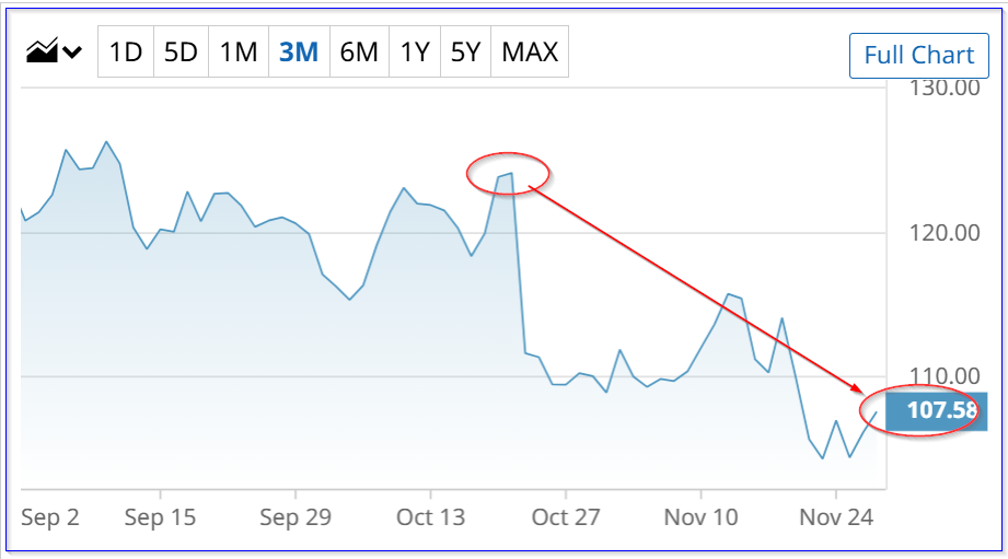 On Oct. 24, I recommended selling short the $106.50 (post-split) put option that was to expire on Friday, Nov. 28. The premium received from doing this was $1.863 for a one-month short play. The strike price was about 4% or so below the trading price.