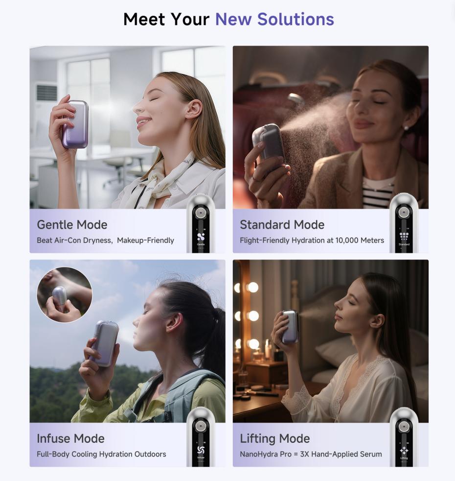 Designed to solve the common problem where ordinary mists merely wet the surface of the skin without absorbing, the NanoHydra Pro boasts an industry-first AI Dual-Pump System. Engineered to produce a "golden particle size" of 10-30 µm, the device optimizes mist to fit skin texture gaps, ensuring deep absorption rather than evaporation. Testing indicates it delivers 2.6 times more effective hydration than standard spray bottles, effectively making one bottle of toner act like two.