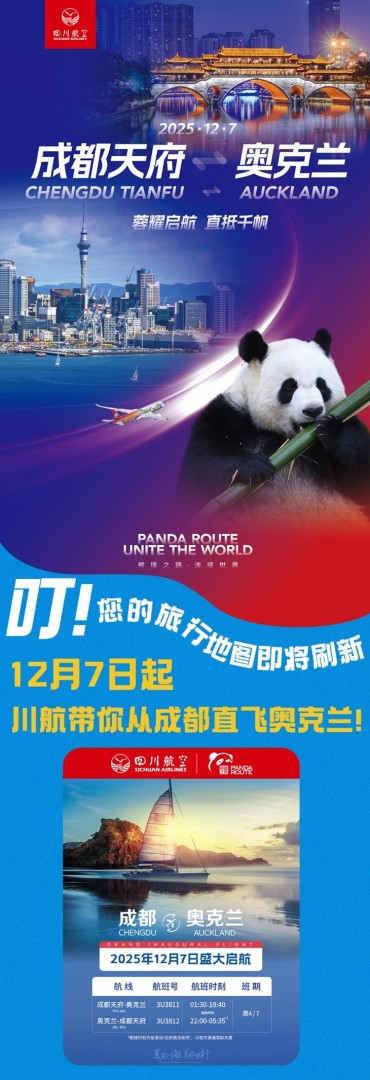 Sichuan Airlines will resume its direct flight service from Chengdu to New Zealand’s Auckland on December 7. As the key airway connecting central and western China with New Zealand, the resumption of flights features 2 additional flights per week aboard the ultra wide-body passenger aircraft A350. With greater transportation capacity and higher frequency, the service will set up a “golden air bridge” for economic, trade, and cultural exchanges between China and New Zealand, while delivering a more comfortable and enjoyable flight experience for passengers.