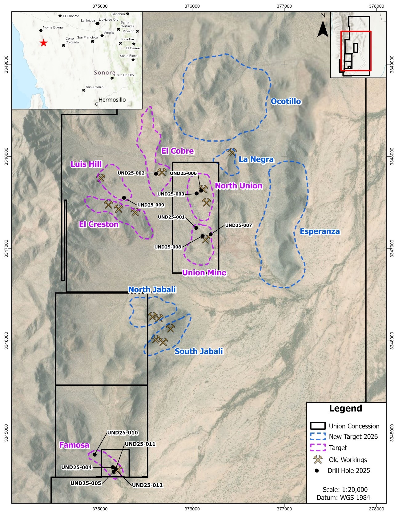• Follow-up exploration at Luis Hill, where Phase 1 drill hole UND25-9 returned 42m grading 0.3 g/t gold in sediment-hosted rocks representing a new style of Carlin-like gold mineralization for this part of Sonora. Phase 2 field work will expand upon this discovery to define additional drill targets.